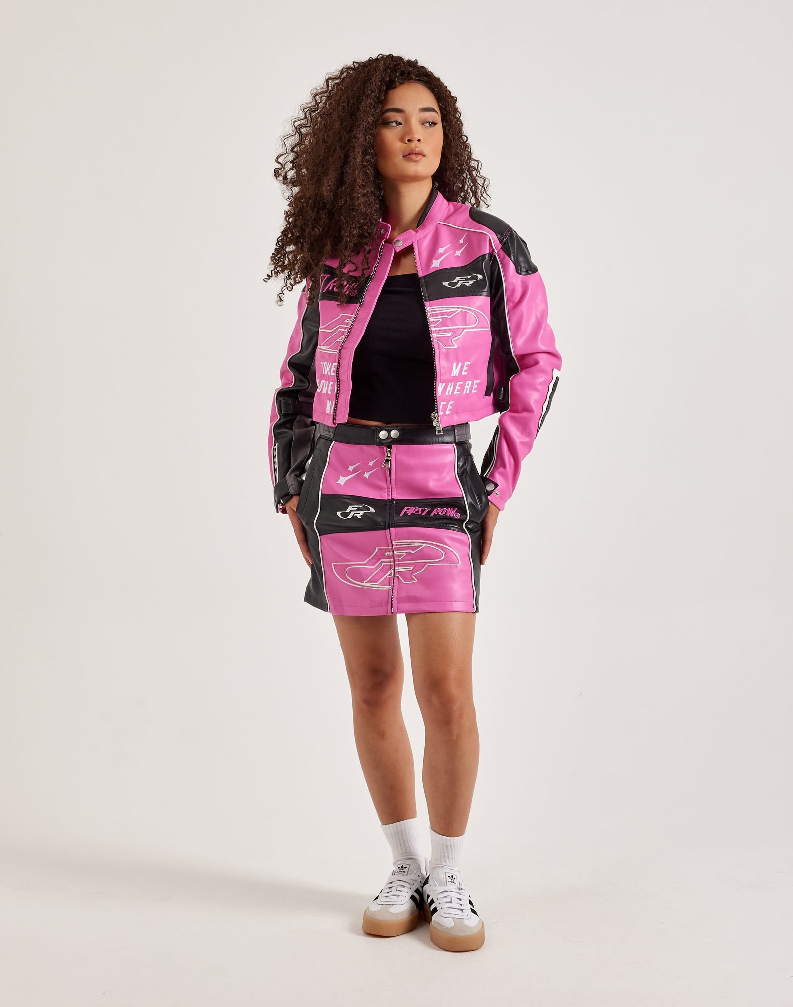 Take your look to the finish line with First Row’s new Leather Racing Skirt. This Y2K-inspired skirt comes in a bold pink color and has embroidered embellishments. Pair it with the matching Leather Racing Jacket to complete the look.