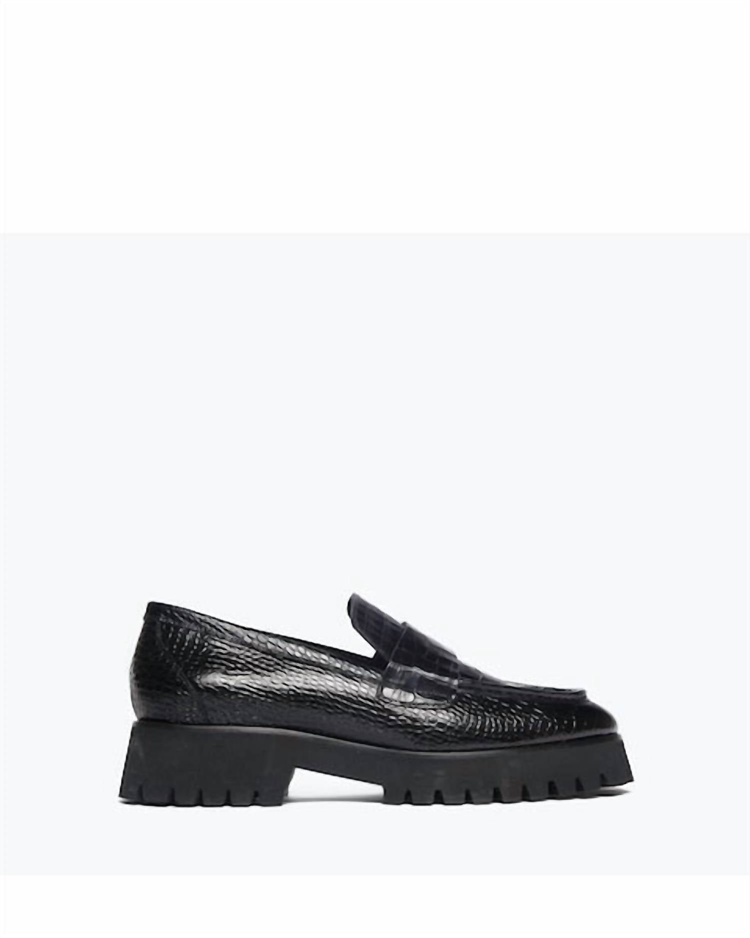 Loafers so versatile you can wear them with just about anything.Step up your style with the Women’s Hana Croc Embossed Loafers by FREDA SALVADOR, a chic fusion of classic and contemporary design. Featuring a statement chunky heel and a round toe, these loafers are handcrafted from black embossed 100% Italian leather, lined with 100% Spanish leather, ensuring durability and comfort. The tonal rubber EVA lug sole with a 1.5′ heel and 1′ platform provides a modern edge, perfect for both dressing up and down. Ideal for workwear or church occasions, these low-heeled loafers are a must-have for the spring season.