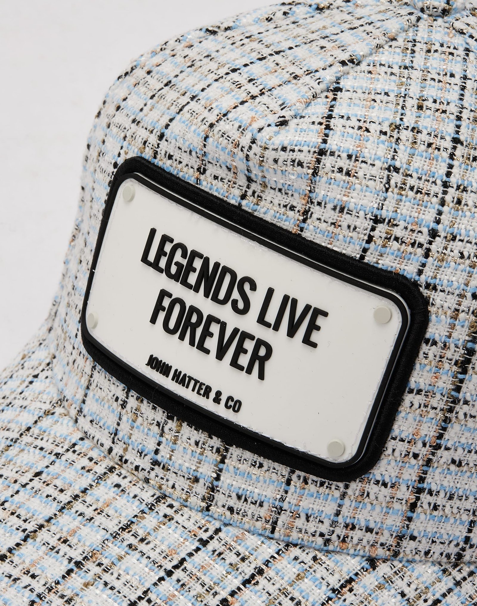 Add the missing piece to your streetwear look. The John Hatter Legends Live Forever Cap is a woven hat with a thick, rubberized badge on the crown. It features an all-over plaid design for extra style.