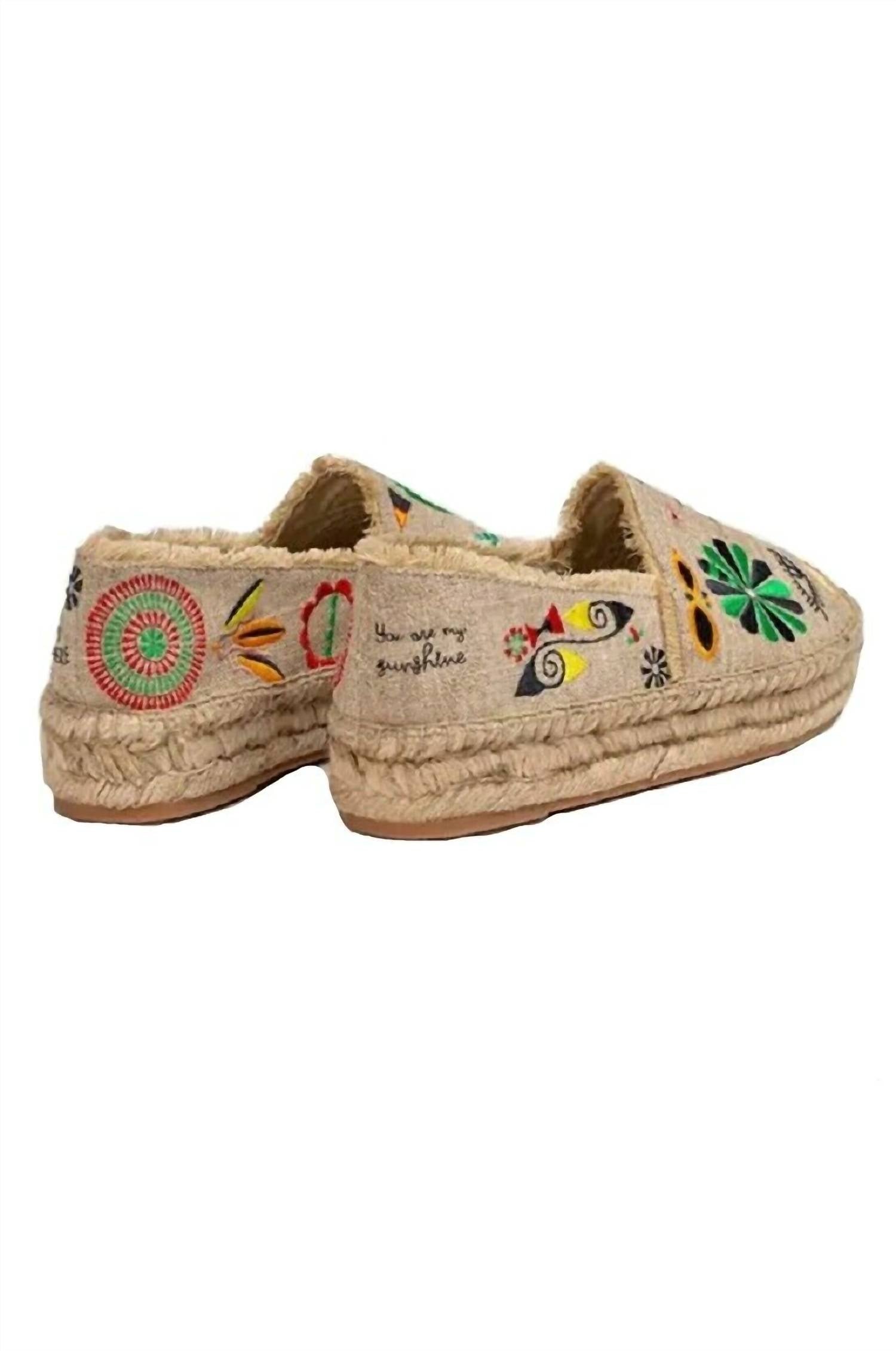 Nothing says vacation quite like a nice pair of espadrilles.Festive floral an embroidered detailing. Linen. Different embroidery on each shoe.