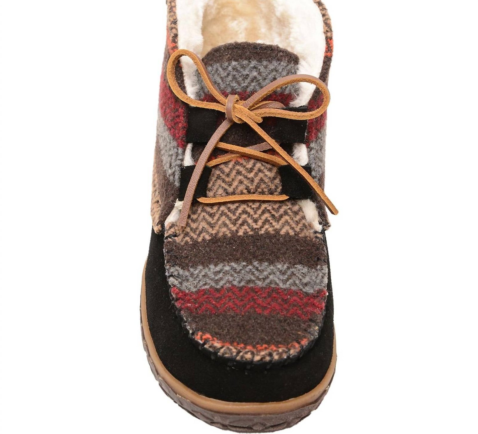 Say hello to the perfect, most versatile boot. The ankle height makes this style easily transition from day to night. Wear them with your favorite skinny jeans and tee for a more laid back look, or pair them with your favorite mini dress and jacket for a night out on the town.Step into comfort and style with the Minnetonka Women’s Torrey Suede Slippers in Black/Multi, perfect for boho-chic fall travels or cozy Thanksgiving festivities. These ankle booties boast a suede upper with a blanket material accent, offering a warm pile lining for ultimate comfort. Featuring a removable contoured footbed and a heavily treaded rubber sole, these boots ensure great traction and adaptability for both indoor and outdoor use. Closure is secured with a rawhide lace, and they are imported for assured quality.