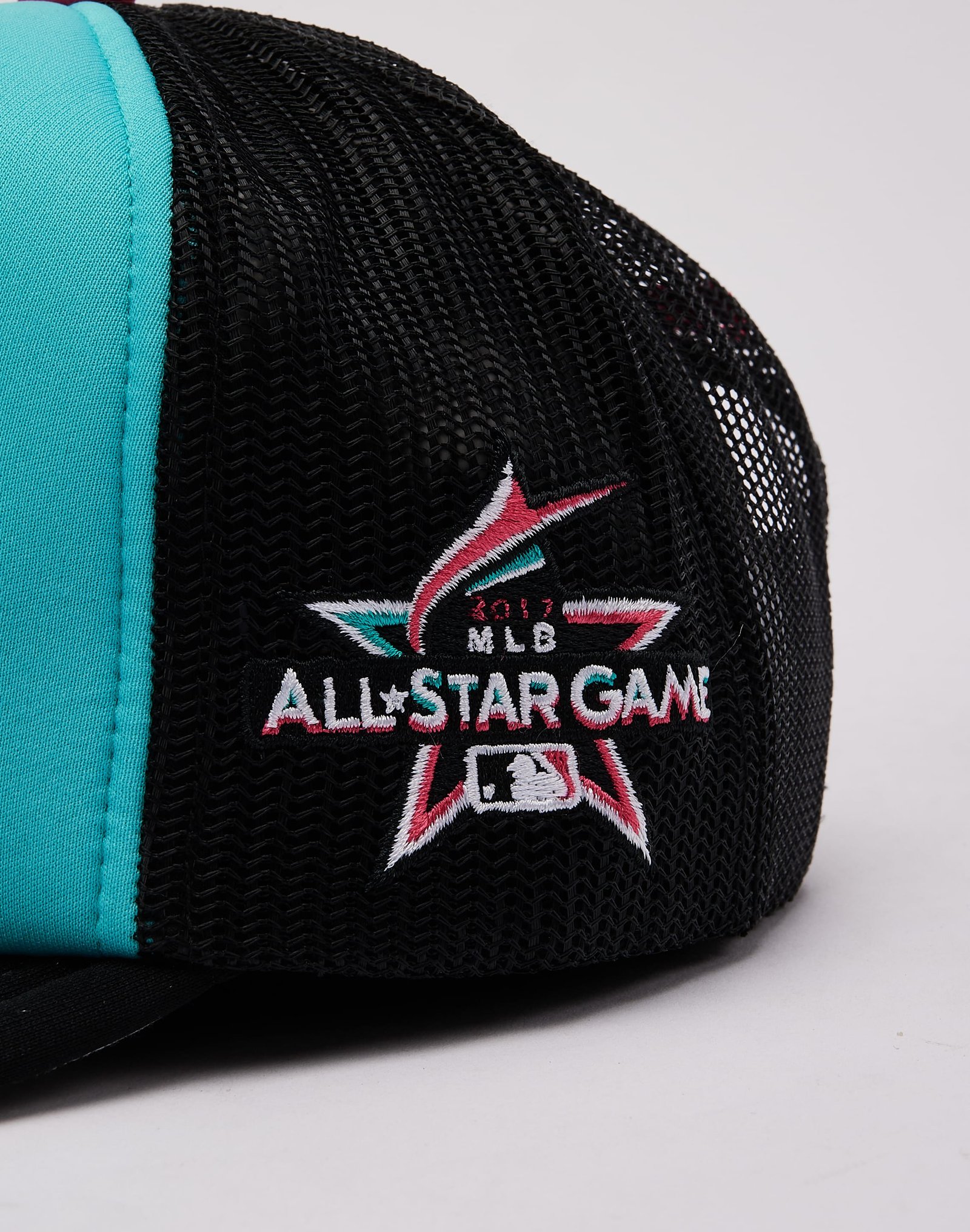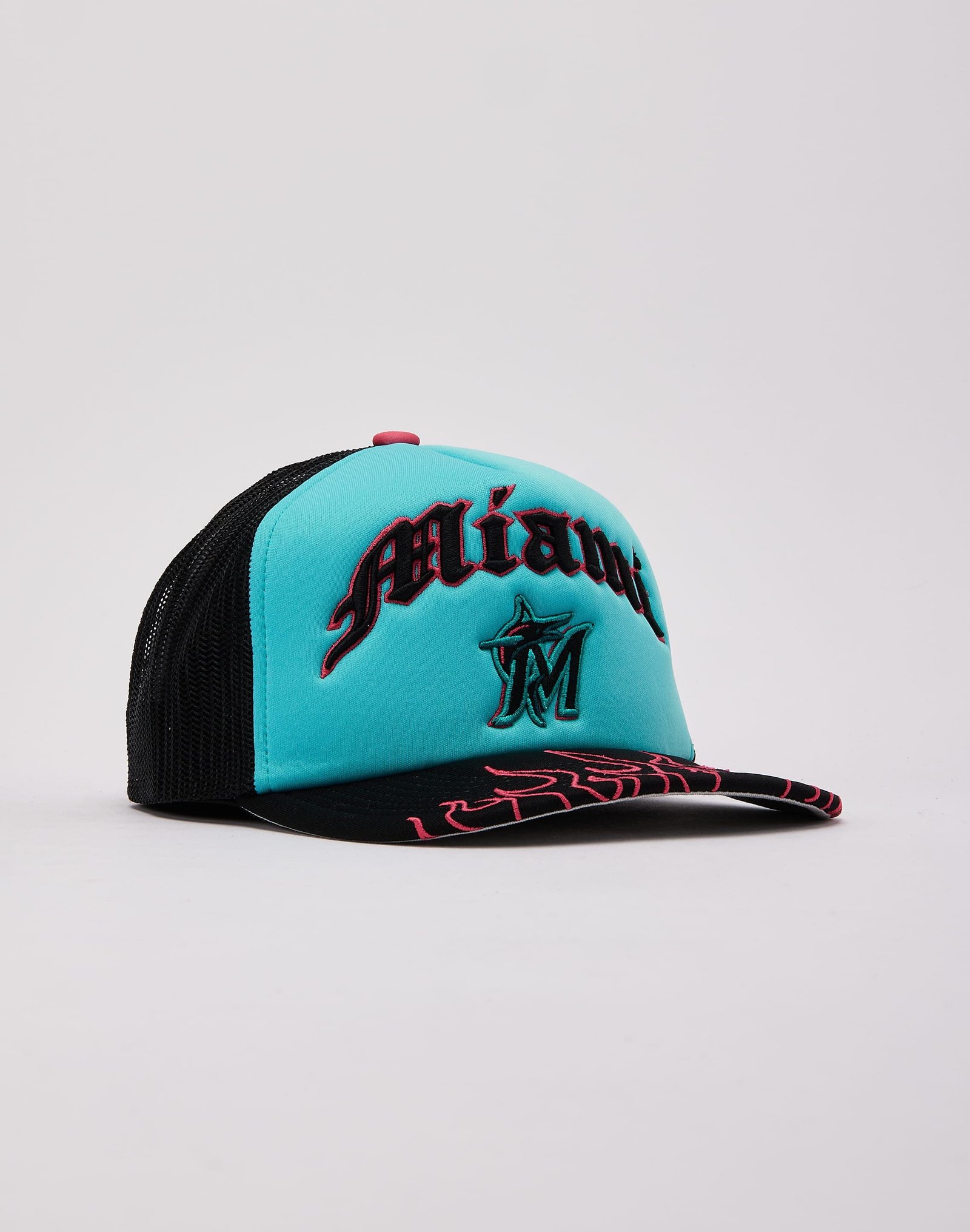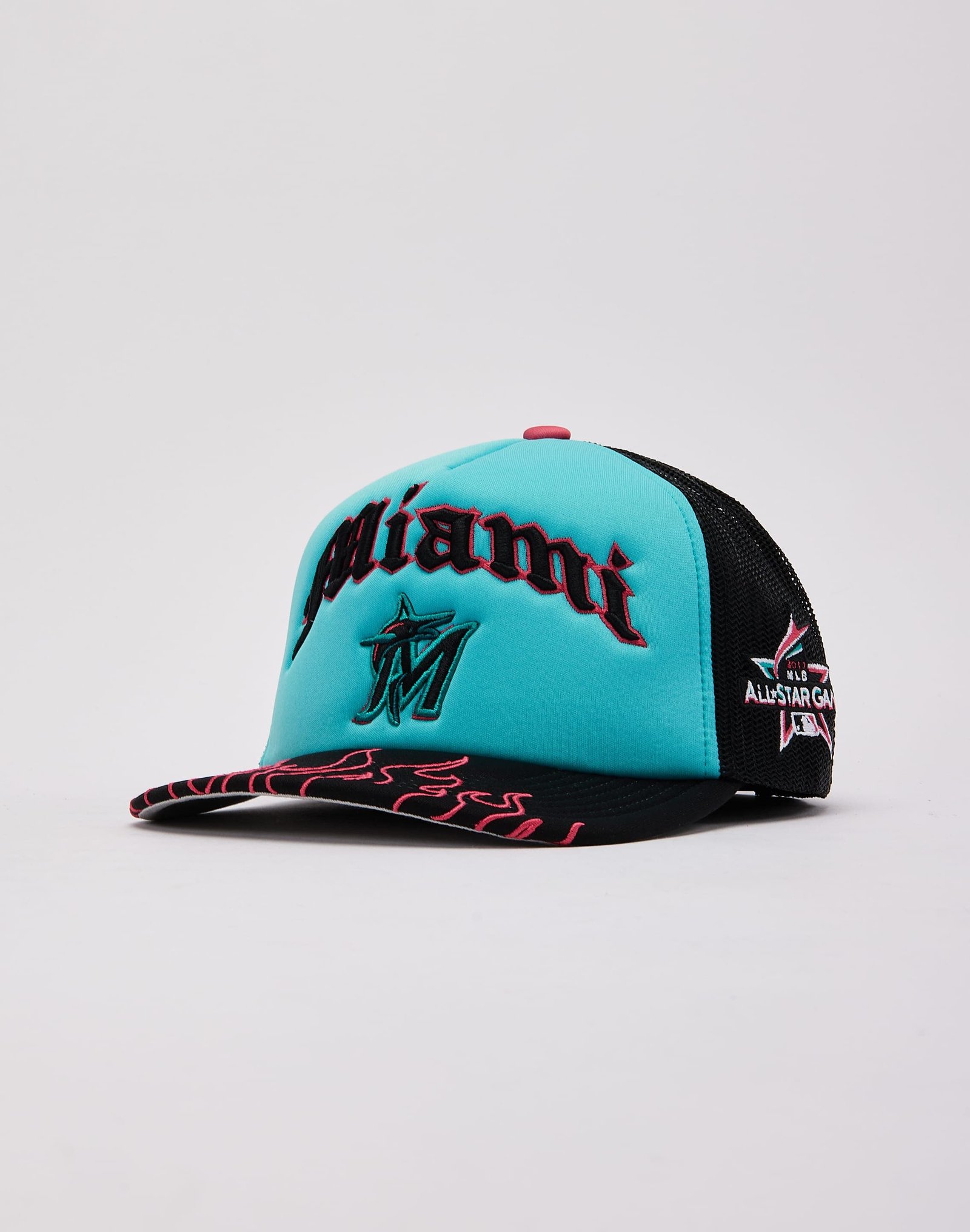 The Mitchell & Ness Miami Marlins Flames Trucker Hat blends vintage style with team pride, featuring bold embroidery and breathable mesh panels. An adjustable snapback closure ensures a comfortable, custom fit for all-day wear.