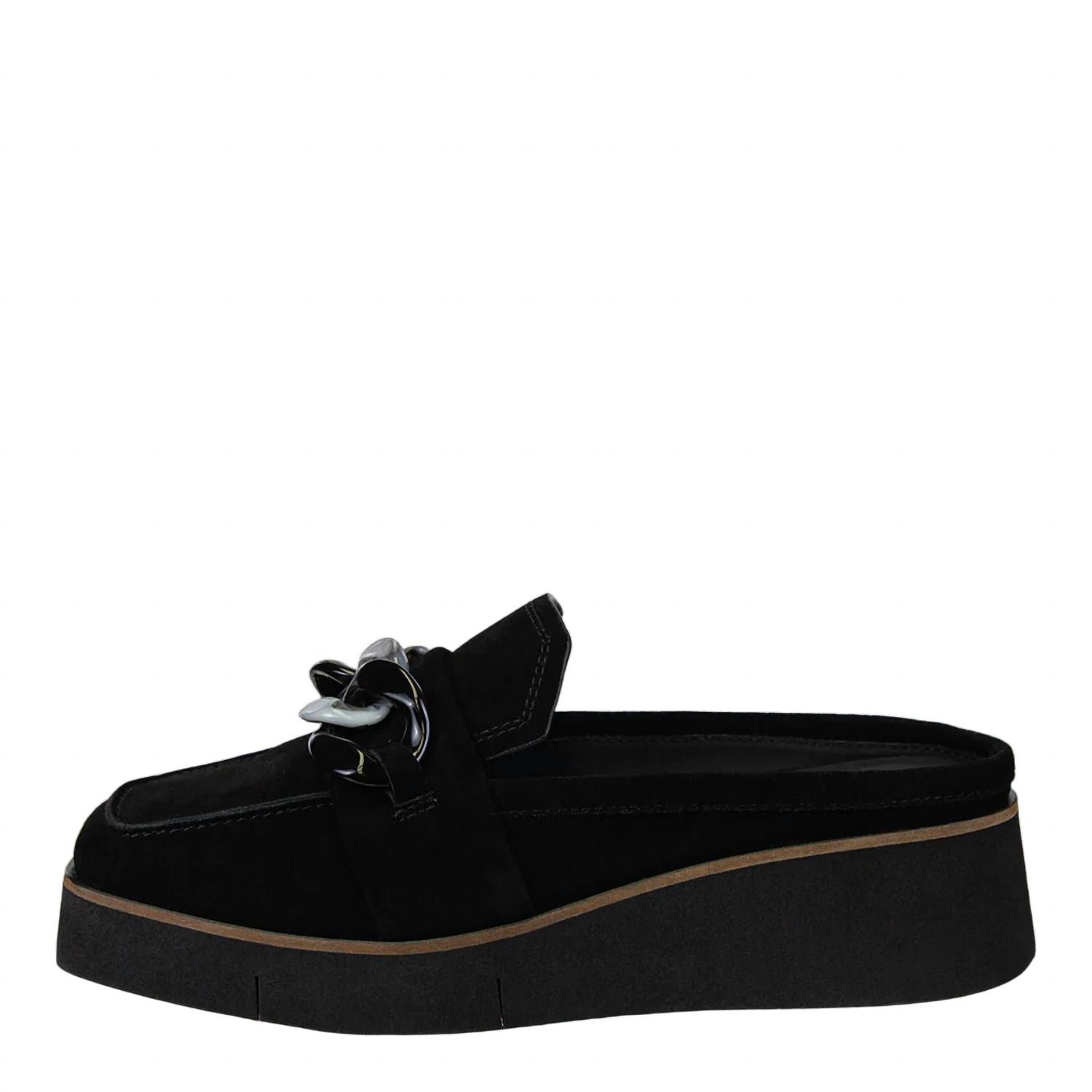 A classic loafer that is both comfortable and polished.Step into understated elegance with the Women’s Elect Loafer by Naked Feet, a black suede platform loafer mule designed to seamlessly transition from desk to dinner. Handcrafted with genuine leather and featuring a sophisticated gold chain-link ornament, these loafers offer a touch of luxury. The square moc-toe design adds a modern twist, while the vegan leather lining and padded sock provide all-day comfort. Closure: Slip-on. The 1.77′ EVA platform and outsole with flex grooves ensure effortless style and support. Perfect for a minimalist and versatile wardrobe, these loafers are an ideal choice for travel or any spring occasion.