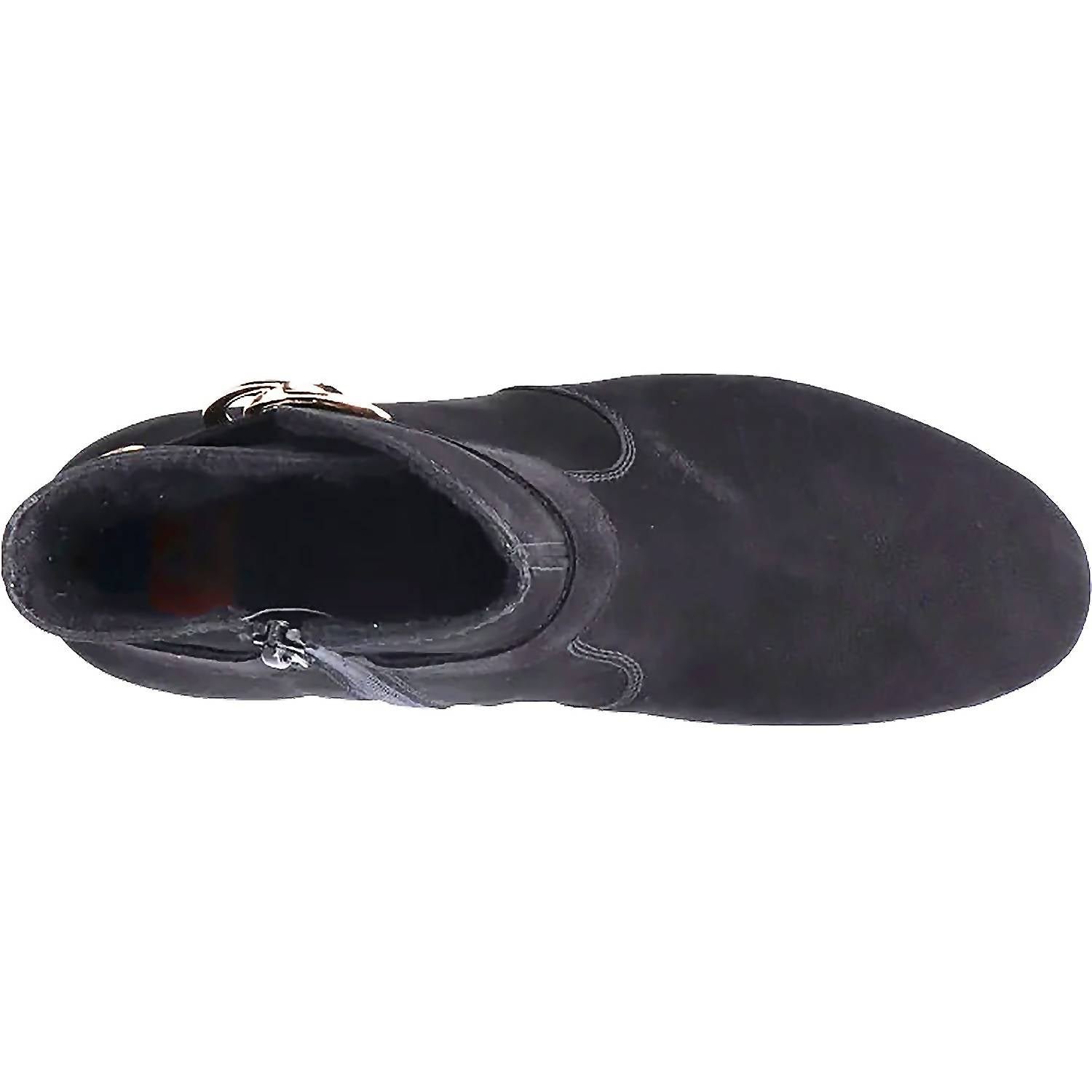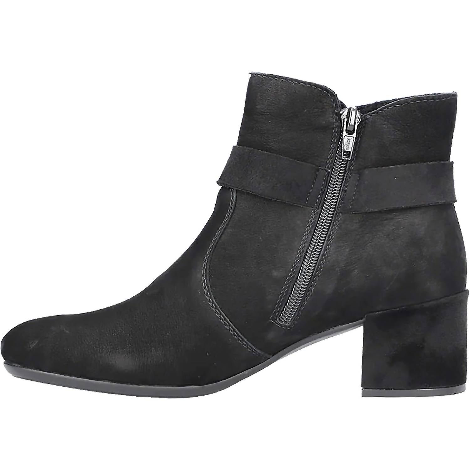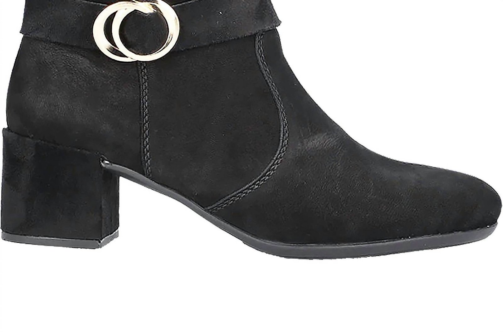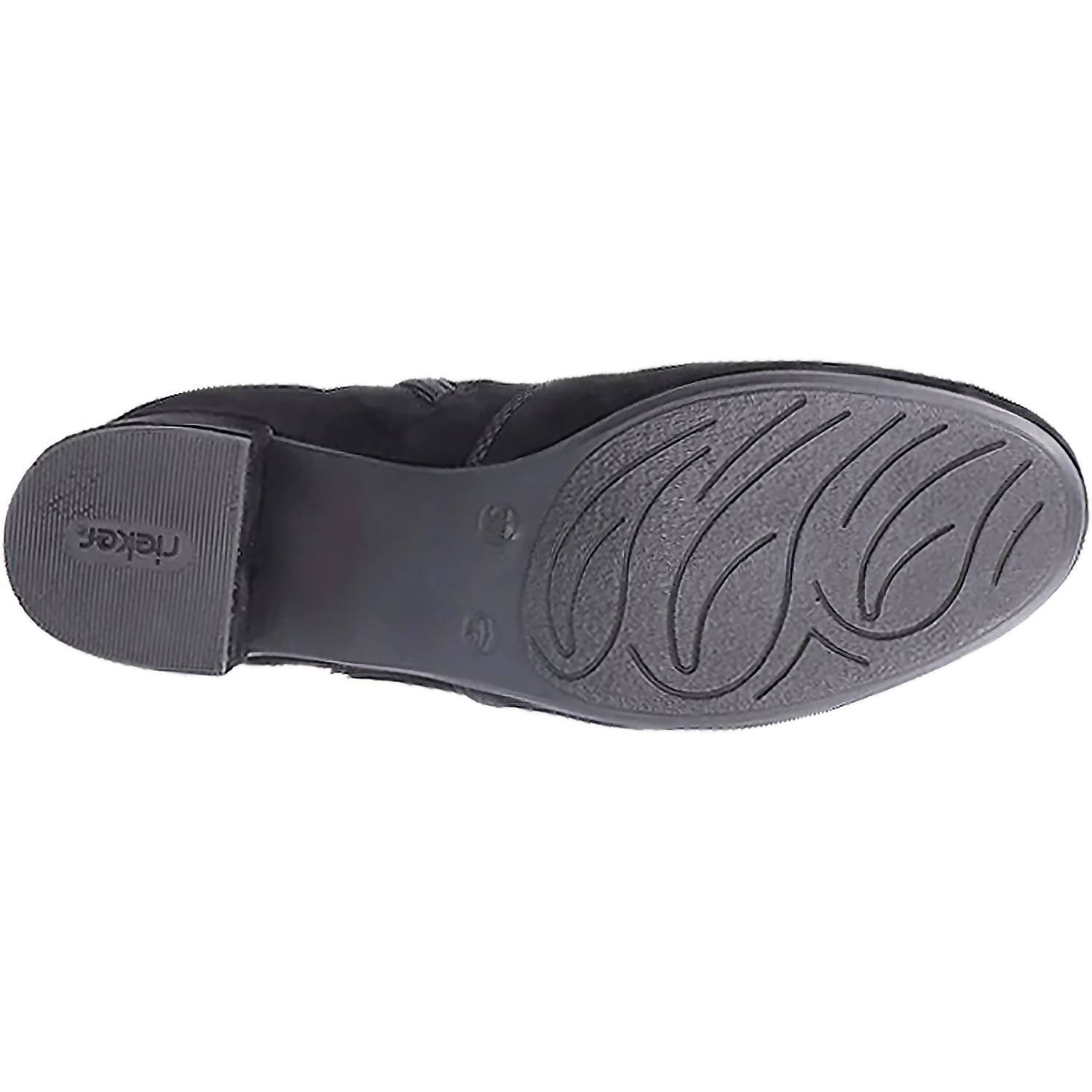 Say hello to the perfect, most versatile boot. The ankle height makes this style easily transition from day to night. Wear them with your favorite skinny jeans and tee for a more laid back look, or pair them with your favorite mini dress and jacket for a night out on the town.Step into style and comfort with the Women’s Sarah 89 Casual Ankle Suede Boots by RIEKER, perfect for your Thanksgiving dinner party. Crafted from luxurious black suede, these boots feature a decorative buckle strap and inside zipper for easy wear. Designed with a medium shoe width and a round toe, the block heel stands at an approximate height of 1.96 inches, offering both elegance and support. Experience superior comfort with the cushioned leather Rieker Antistress insole, flexible hand stitching, and a shock-absorbing outsole for an all-day minimalist appeal.
