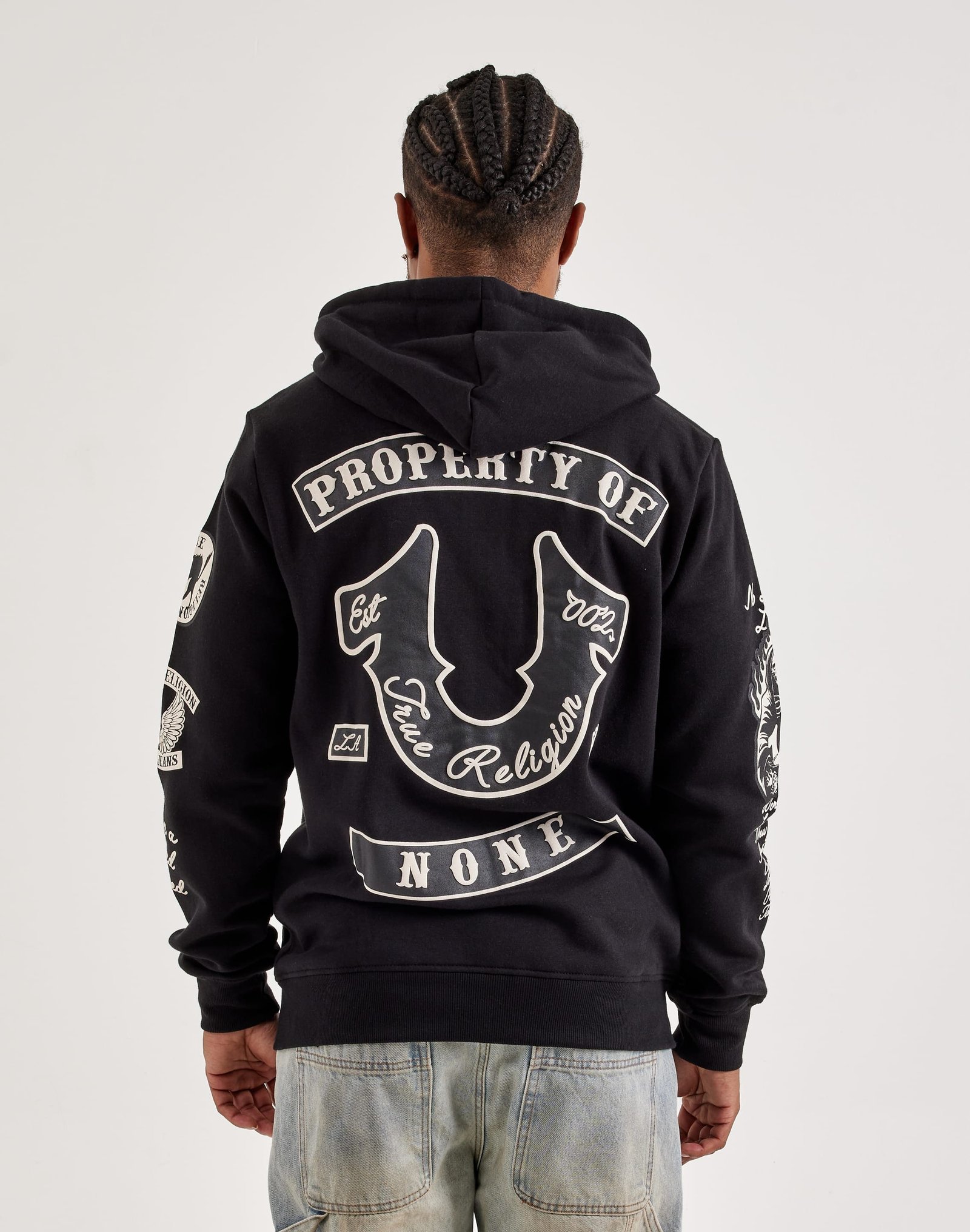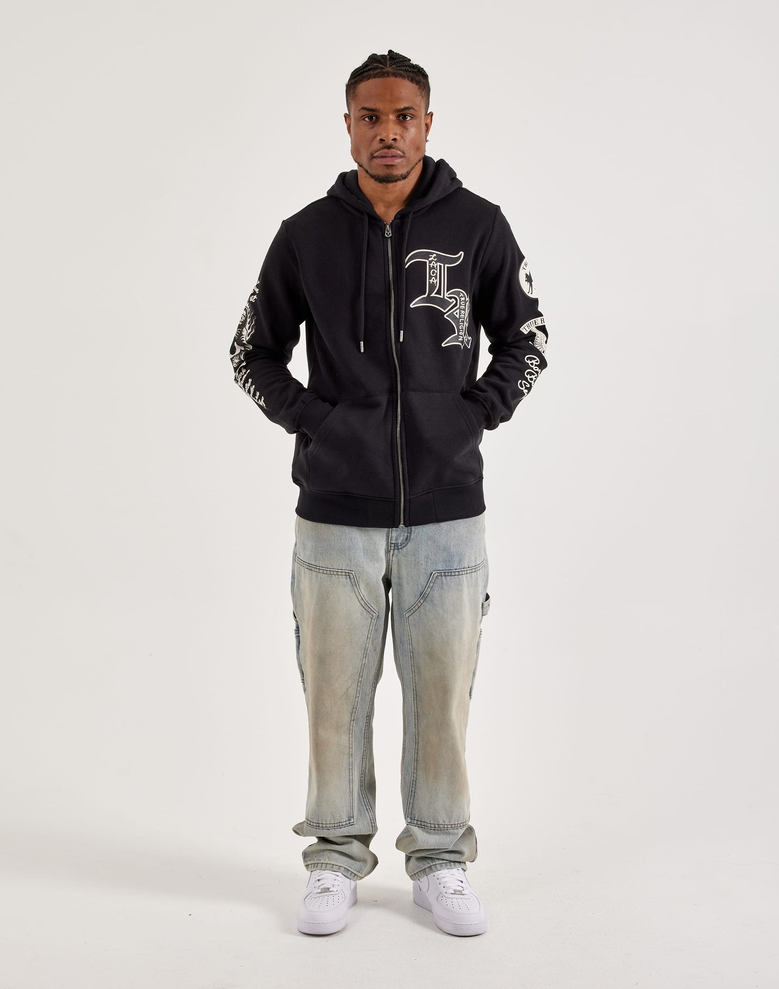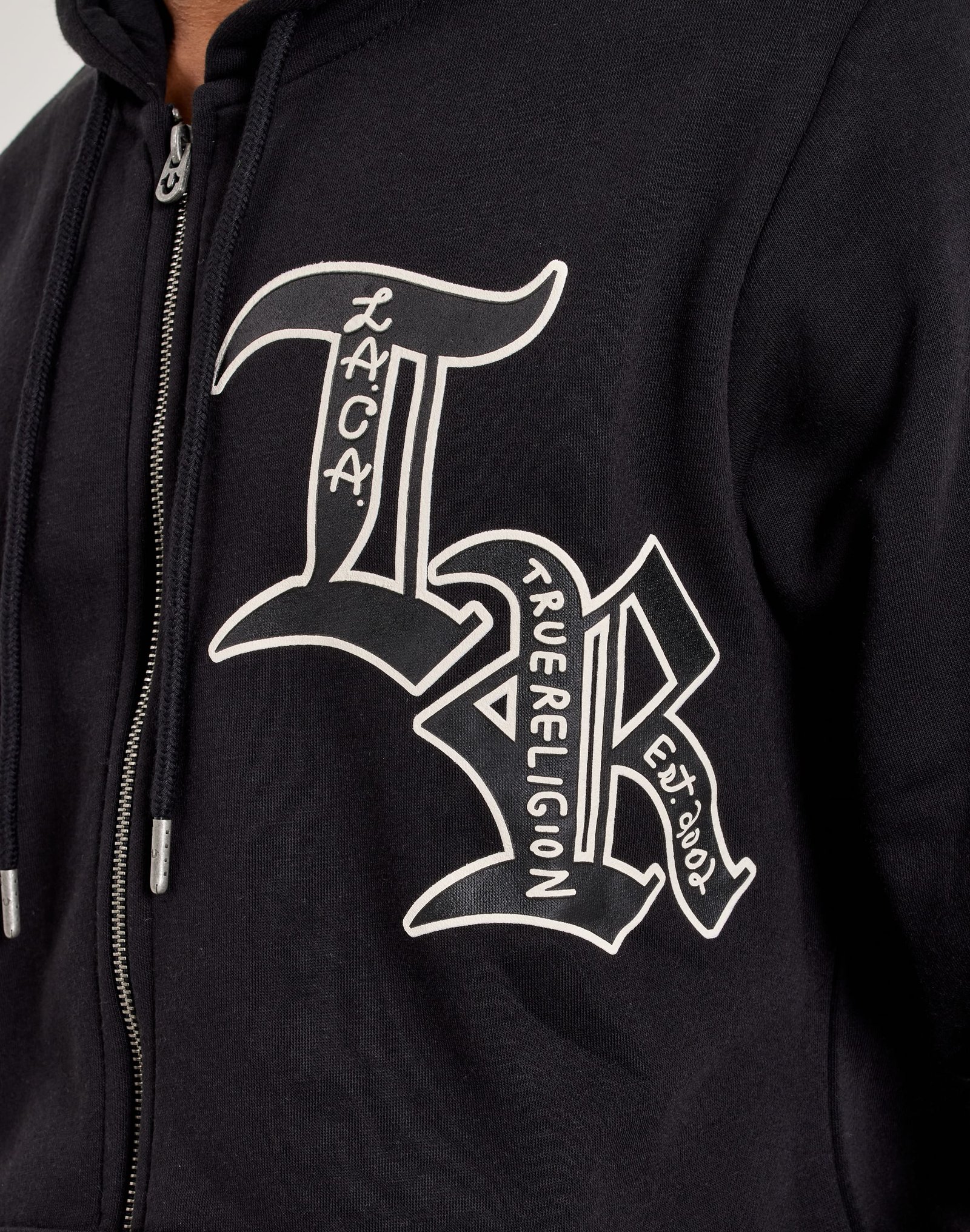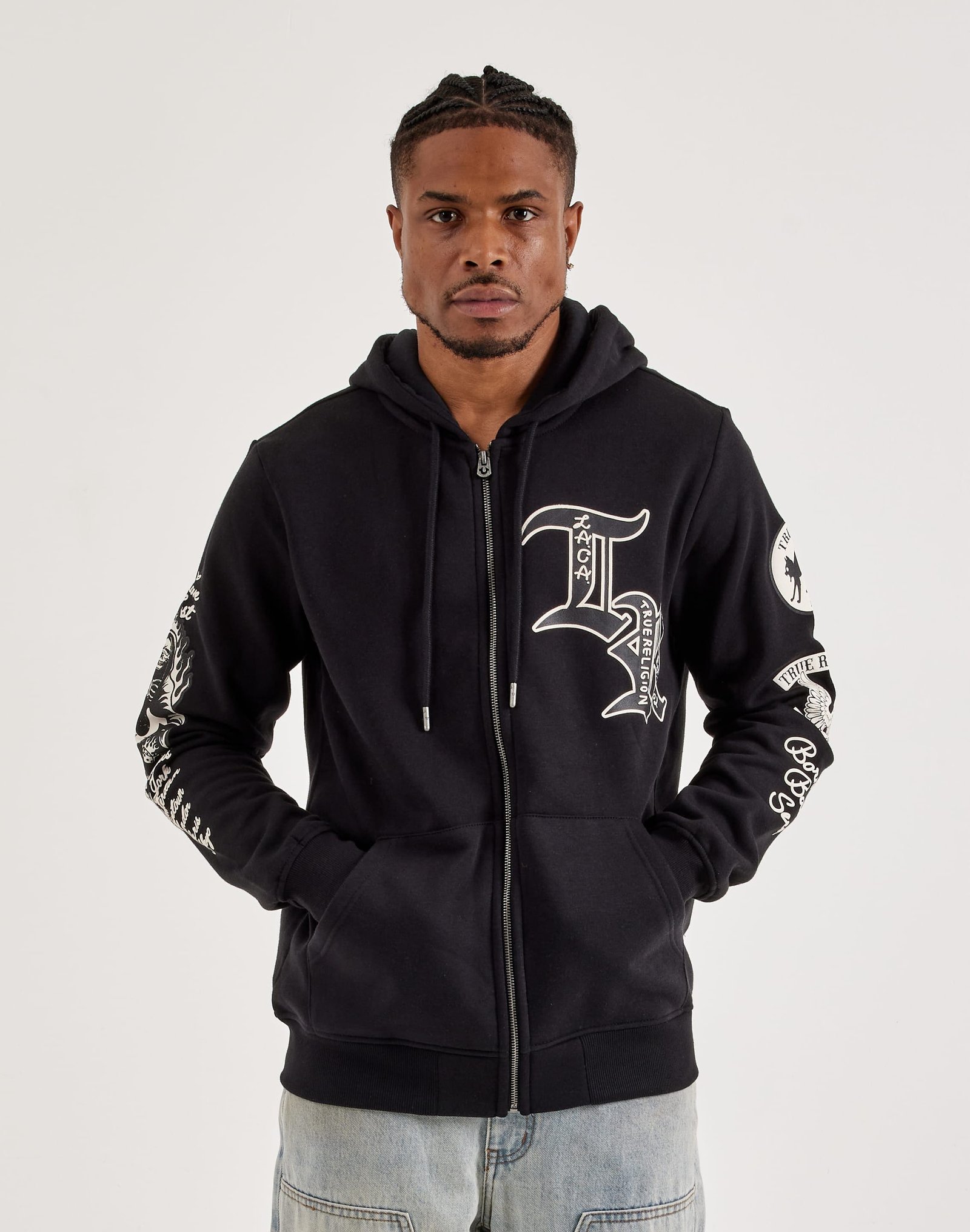 Stay warm in signature style with this DTLR-exclusive True Religion Full-Zip Fleece Hoodie. Featuring soft fleece fabric and bold branding on the front, back, and sleeves, it??s the perfect blend of comfort and street-ready edge.