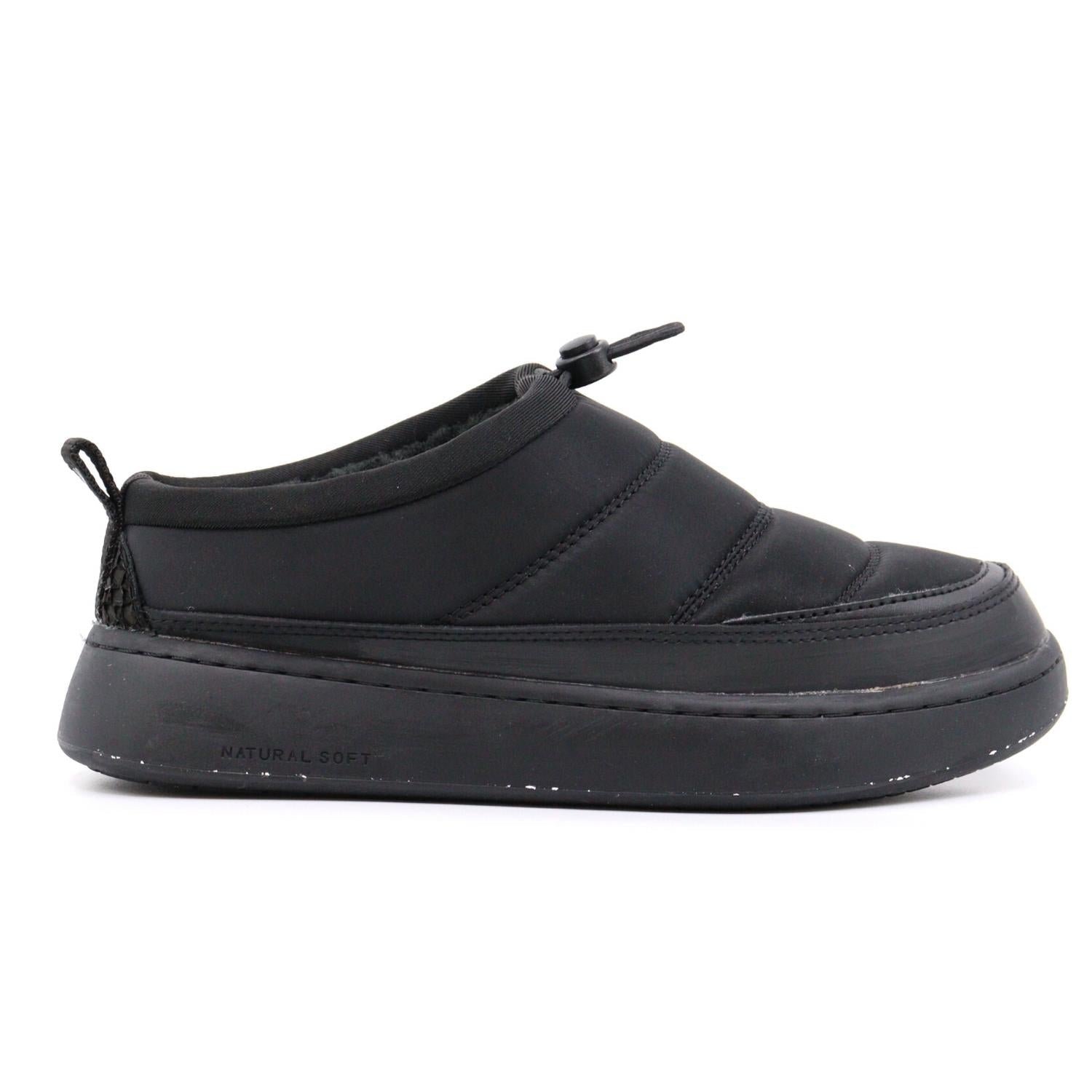 Slip them on and go! Introducing the Women’s Molly Mule from Woden, stylishly made from recycled nylon in black. Designed for comfort, it features a rubber sole with Natural Soft technology and a warm lining. The water-repellent finish and padded insulation ensure a snug fit, while the round toe allows for room. Elegant fish leather accents and a cork insole with Airflow make these mules both eco-friendly and chic.
